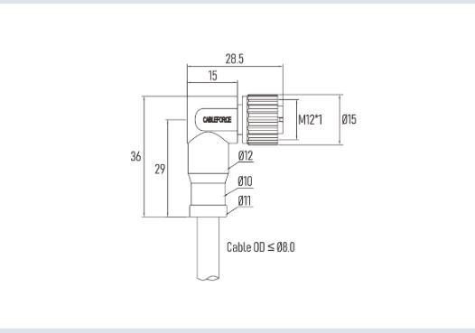 • M12 a-Code 5pin Female Right Angled Connector Molded with 5X22AWG Cable, Plastic Screw