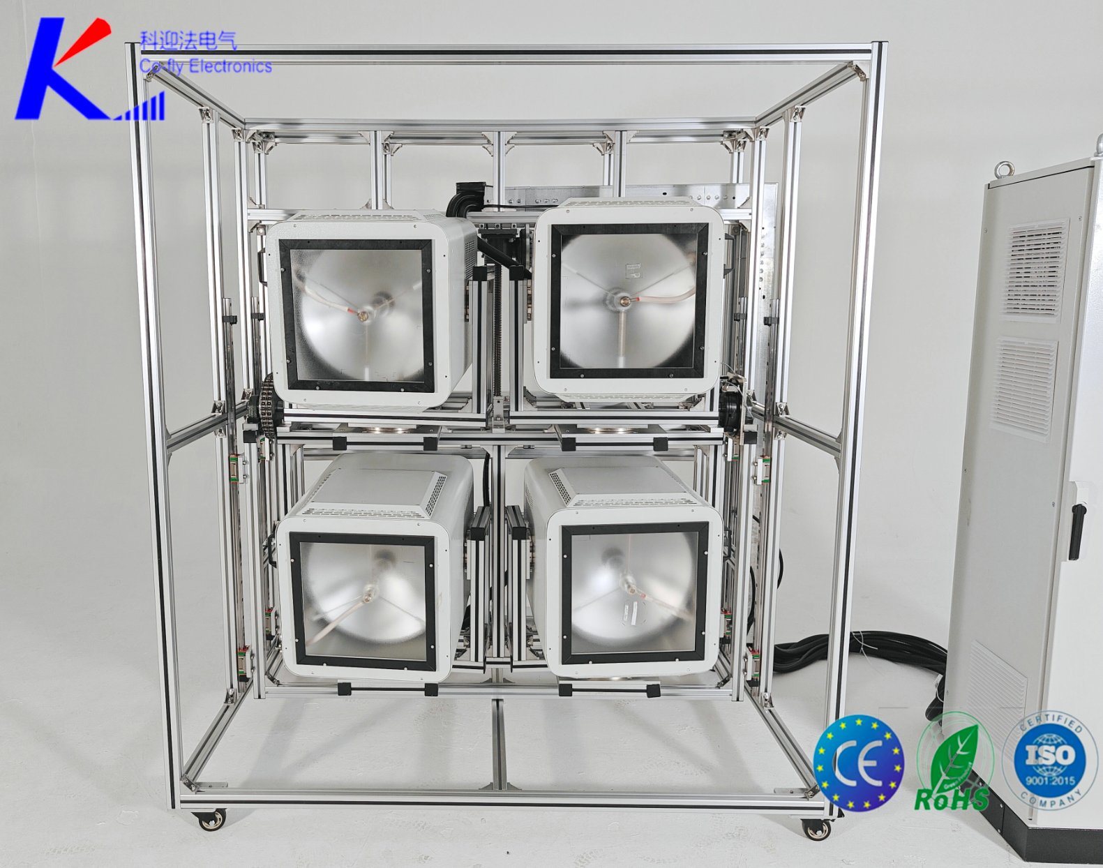 Solar simulator, the light source equipment which is independent researched & produced by Shanghai Co-fly electronics Co.,Ltd.The equipment is included central control machine,matlab software and data acquisition system.We can customize the equipment as your actual request with reliable quality,fast delivery&24 hours after-sales service.Solar simulator can be provided the environment close to natural light which is not affected by environment,climate & time,it can realize 24 hours uninterrupted light source and weathering test for a short time.In addition,the equipment can be fulfilled the requirement of the maximum power of IC 61215-2:2021,hot spot durability test of IEC 63126:2020 &stability test of IEC 61853-2:2016.Solar simulator can be widely used in the test of solar battery,dye-sensitized cell,perovskite battery,photothermal conversion,photoelectric material,biochemistry,photocatalytic degradation,skin cosmetics,aerospace,scientific research unit,automotive full-spectrum sunlight simulation system,etc.The product can be met the standard of IEC 60904-9,ASTM E 927 A-level spectral matching,class A or B irradiance spatial inhomogeneity,Class A Temporal Instability.Main techical parameter:1,Output the sunlight:700-1300Wm2 continuously adjustable.2,Direction of light:vertically up/down,horizontal left/right.3,Radiation area: 100mm*100mm-2600mm*2800mm4,Internationl standard for light matching/Irradiance Spatial Uniformity/temporal instability: JIS C 8912,ASTM E927-05,IEC 60904-9 2007 ED25,Collimation angle: Less than or equal to 2.5 degrees half angle6,Averaging technique:Double fly eye lens combination7,Lamp life: Average 2000 hours8,Shutter control time:0.1S-9990 Hours.9,Security lock:When the light source box cover is opened, the light source will be automatically turn off.10,Temperature sensor and self-locking system ensure the operator's safety.11,Fan power-off delay function,equipment cooling system delay power-off system,no need to stay manually,save time at work&improve equipment's life.Product Features:1,High stablity,durability,Ozone-free lamp.2,Excellent light distribution,uniformity & stability.3,Solid body,easy to operate & install.4,light matching,Irradiation unevenness,Irradiation time instability can be customized as your request.5,Can be measured 6 parameters:Voc,Isc,FF,Imax,Vmax,Pmax,Rs,RshProcess flow:Product design--Drawing approval--Purchasing parts--Material inspection--Equipment assembly--Technical debugging--Performance correction--QC test--Aging test--Appearance QC-Package
